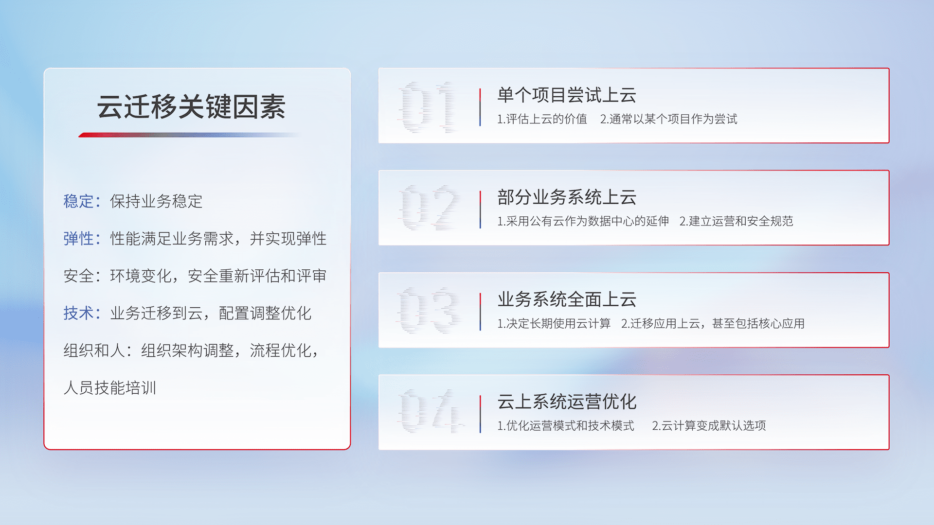 结合实际业务,,,,从规划设计、、、云平台选型、、云原生改造、、、数据迁移、、、、集成交付,,,,迁移全过程为客户识别最佳上云路径,,,,做好风险识别管理,,,,设计网络架构、、、身份权限、、安全审计合规、、、操作审计、、、日志审计、、监控告警策略、、、、多站点容灾设计等,,,对云上基础设施进行整体规划,,,,提升IT治理水平,,,,以满足弹性、、高可用、、、高性能的需求。。。。