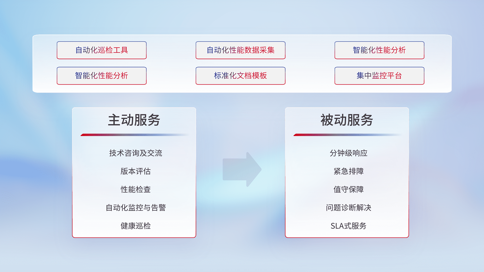 智能化工具和标准化文档,,,,保障服务质量,,提供主动服务(包含技术咨询、、、版本评估、、、性能检查、、、自动化监控与告警、、健康巡检)和被动服务包含(分钟级响应、、、、紧急排障、、值守保障、、、、问题诊断解决、、、、SLA服务)。。